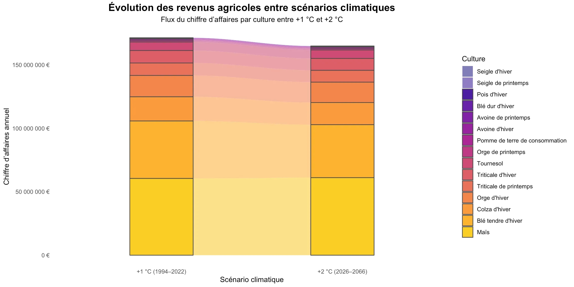 - Conséquences sur les rendements, et la rentabilité de chaque filière, au niveau de réchauffement actuel et dans un futur à 2°C (cf. TRACC)