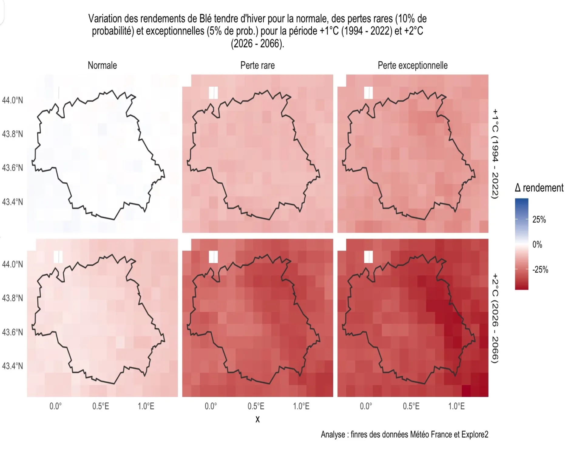 L'analyse climatique s'appuie sur les scénarios de réchauffement de la TRACC (1.5°C, 2.0°C ) et mobilise six combinaisons de modèles climatiques issus de la base Explore2 de Météo France. Chaque production analysée fait l'objet d'une double validation : interne et par des pairs scientifiques indépendants.